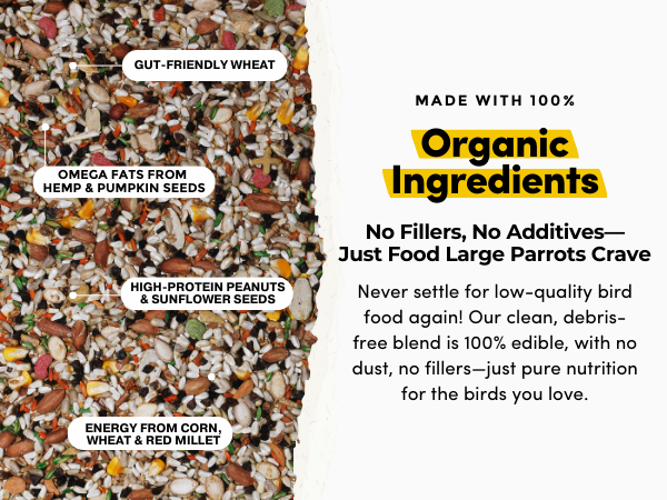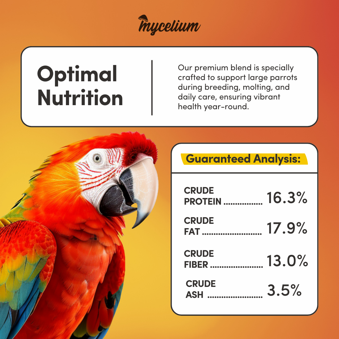 Give your large parrots a wholesome, nutrient-rich diet with Mycelium Large Parrot Plus! Designed for Macaws, Cockatoos, and African Greys, this organic, high-protein blend supports endless energy, strong muscles, and overall vitality. A carefully crafted mix of safflower, hulled sunflower, oat groats, peanuts, pumpkin, wheat, and corn provides natural fats, fiber, and essential nutrients to fuel healthy digestion and active lifestyles. Fortified with key vitamins, minerals, and calcium, it helps maintain sturdy bones and brilliant feathers. Proudly made in the USA, this clean, non-GMO formula gives your parrot the pure, high-quality nutrition they deserve!