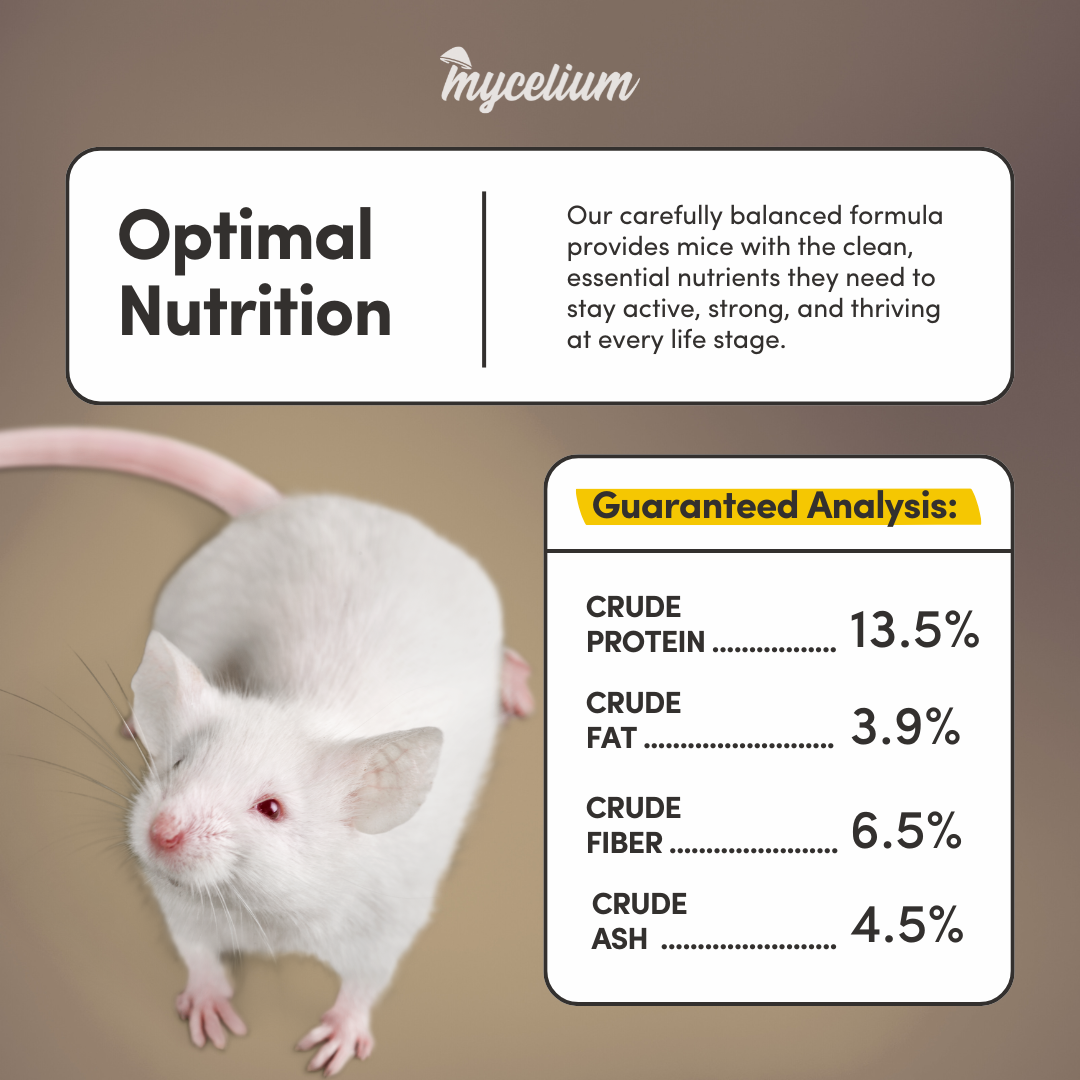 Support your mouse’s health and energy with Mycelium Mouse Feed—a complete, nutrient-rich formula made for daily wellness, growth, and activity. Carefully balanced with plant and animal-based proteins, it promotes lean muscle development and supports a healthy metabolism. Natural fiber aids in gentle digestion and nutrient absorption, while added omega fatty acids help maintain soft fur and healthy skin. With a variety of textures and flavors, this blend encourages natural foraging behavior and keeps mice engaged at every meal.