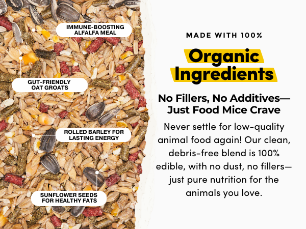 Fine-textured grains like oat groats, wheat, and rice bran are easy for mice to nibble, promoting natural eating habits and daily enrichment.