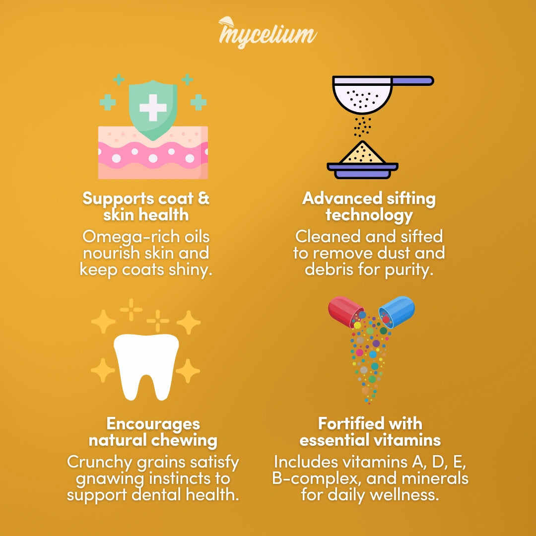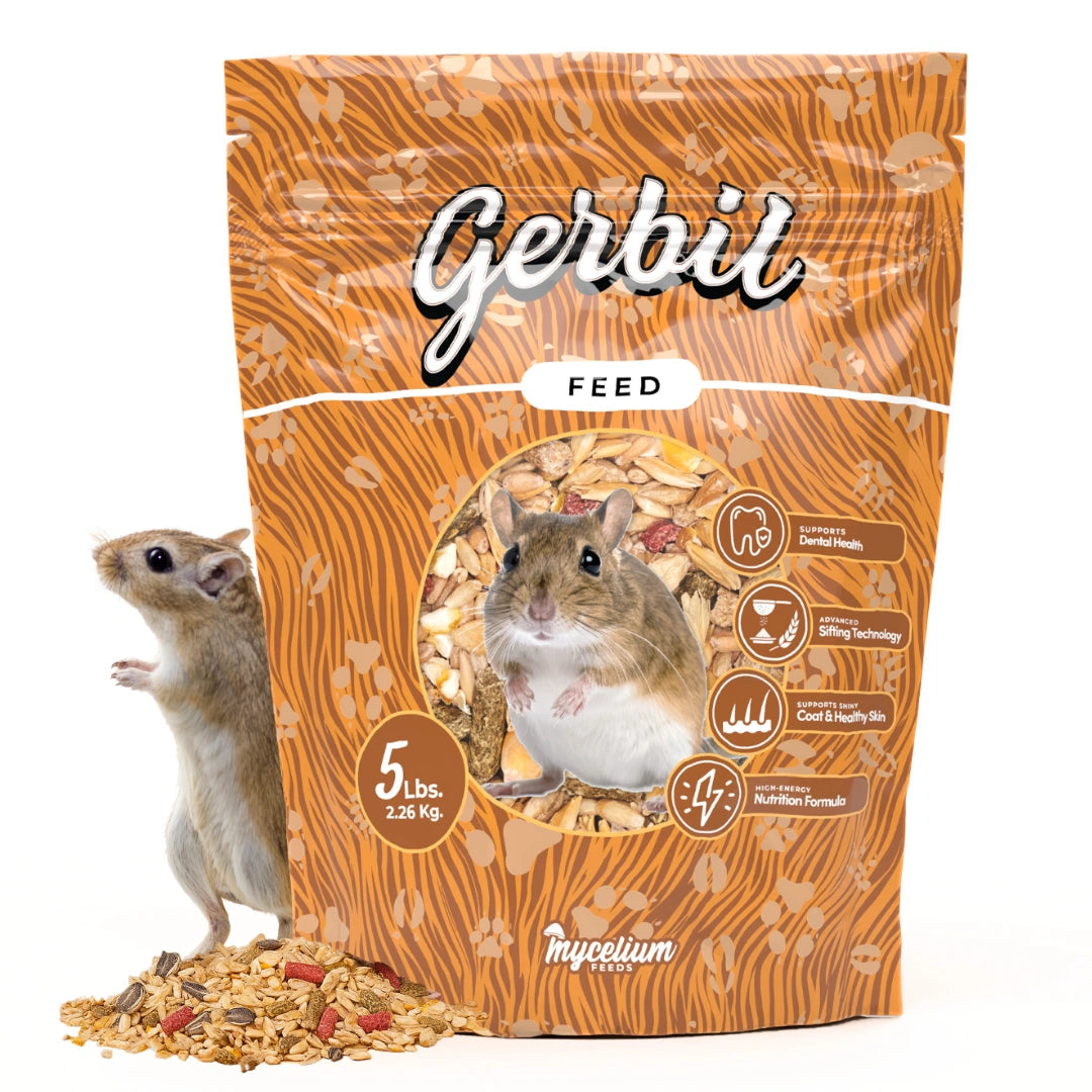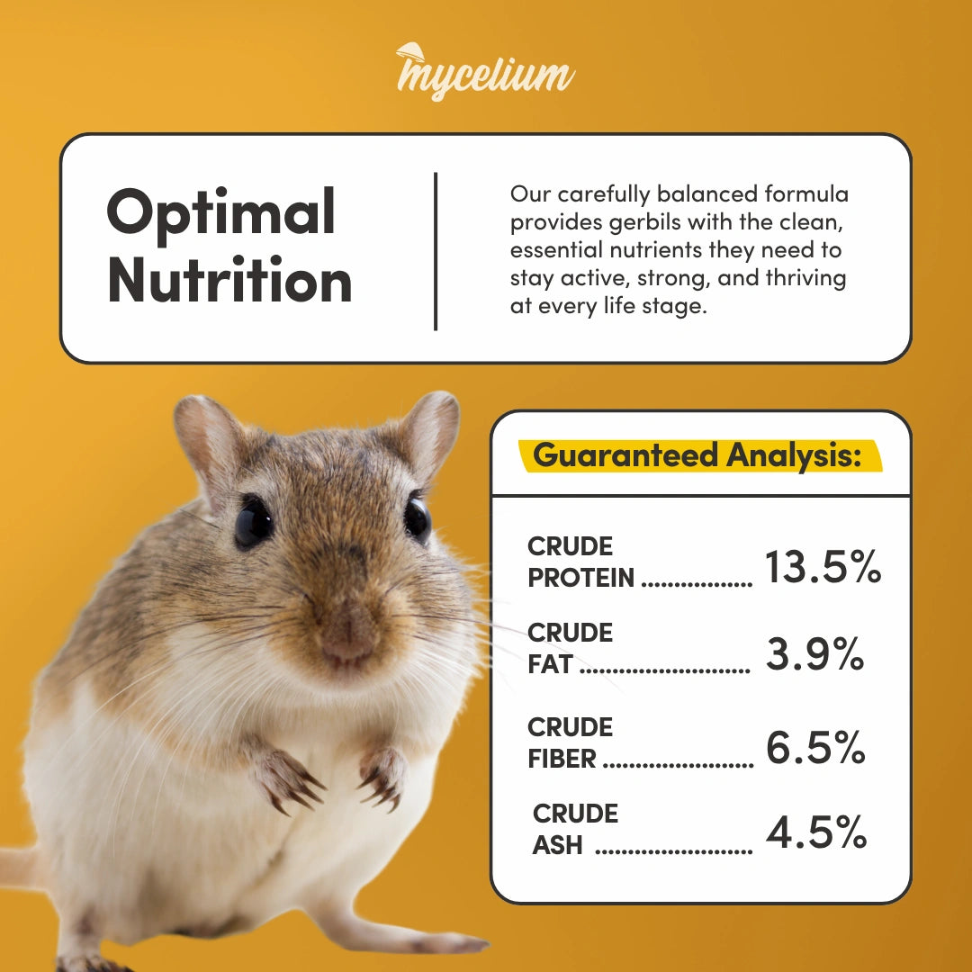 Keep your gerbil energized and thriving with Mycelium Gerbil Feed—a complete daily formula designed for balanced nutrition, activity, and vitality. Made with a blend of energizing grains, it fuels your gerbil’s natural drive to dig, climb, and explore. High-quality protein supports muscle development and strength, while crunchy grains help maintain healthy teeth through natural wear. Omega-rich ingredients nourish the skin and promote a soft, shiny coat, and a combination of natural fiber and fortified nutrients supports both digestion and immune health. It’s everything your gerbil needs for a healthy, active life—packed into one wholesome blend.