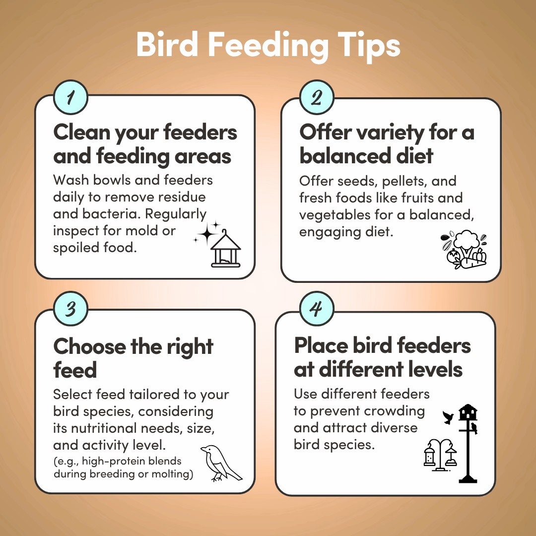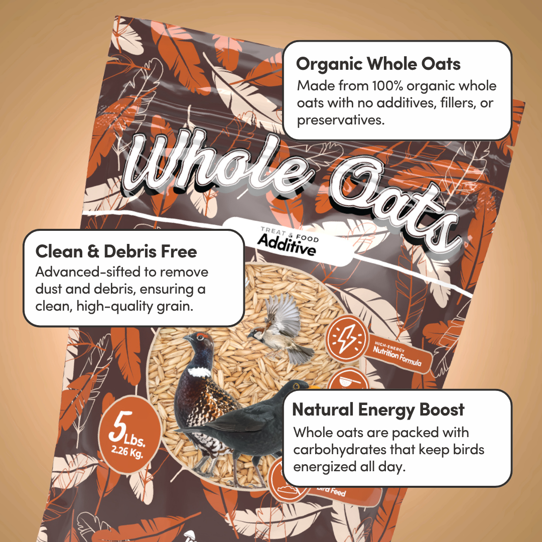 Daily Portions: Offer whole oats as a treat or food additive. Whole oats are best used alongside a complete feed or seed mix to support balanced daily nutrition.
