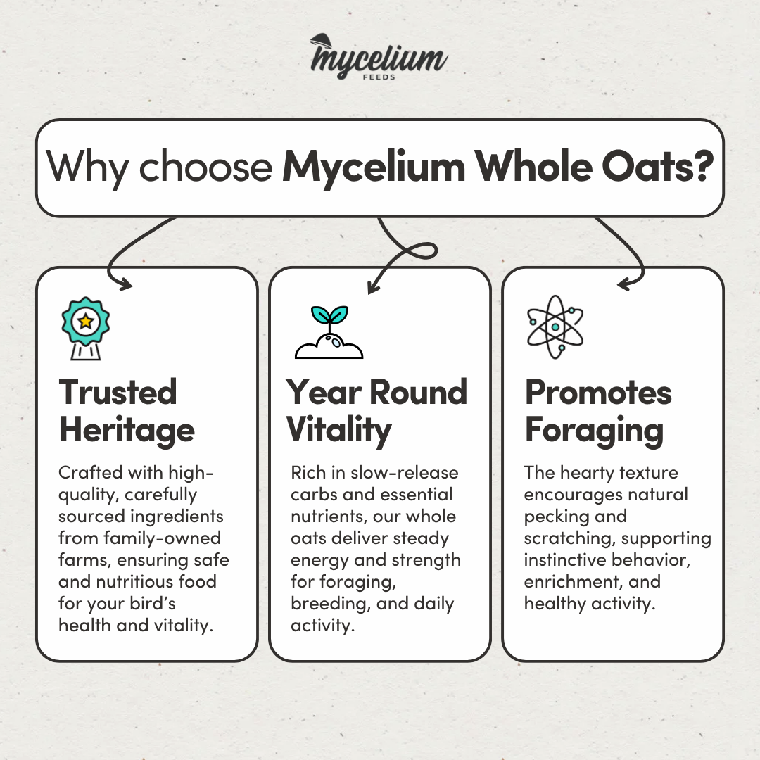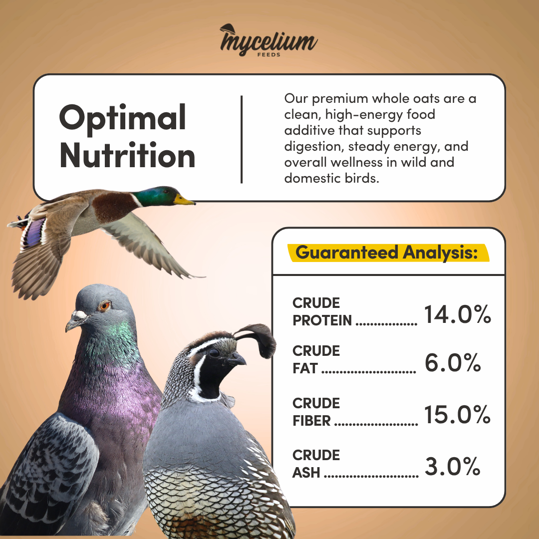 Nourish your flock with Mycelium Premium Organic Whole Oats — a high-energy grain treat and food additive loved by ducks, pigeons, quail, turkeys, and other ground-feeding birds. Packed with slow-burning carbohydrates and natural fiber, it supports smooth digestion, strength, and daily vitality. Ideal for scattered feeding or mixing into daily blends, this organic, Non-GMO grain delivers clean, USA-grown nutrition year-round.
