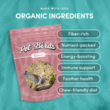 Mycelium Pet Bird Food delivers a nutrient-rich blend of millet, safflower, sunflower, oat groats, buckwheat, and canary seed, tailored to the dietary needs of Cockatiels, Lovebirds, Parakeets, and other small birds. Enriched with Omega-3s and essential nutrients, it promotes energy, vibrant plumage, and smooth digestion. Made with organic, non-GMO ingredients from family-owned farms in the USA, this mix supports health through molting, breeding, and daily care while staying free from artificial additives and pesticides.